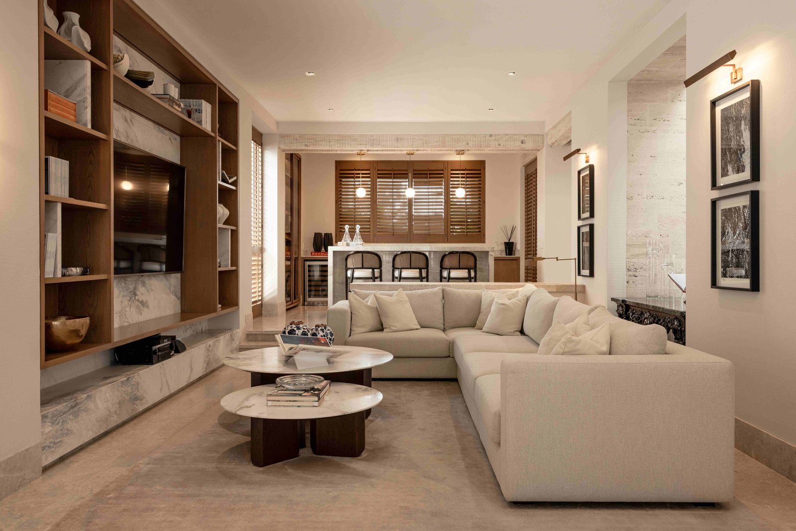 Luxurious living room with cream sectional sofa and marble coffee tables