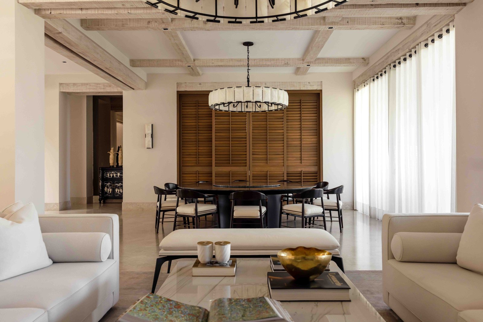 Open concept living and dining area with exposed wood beams and cream furnishings